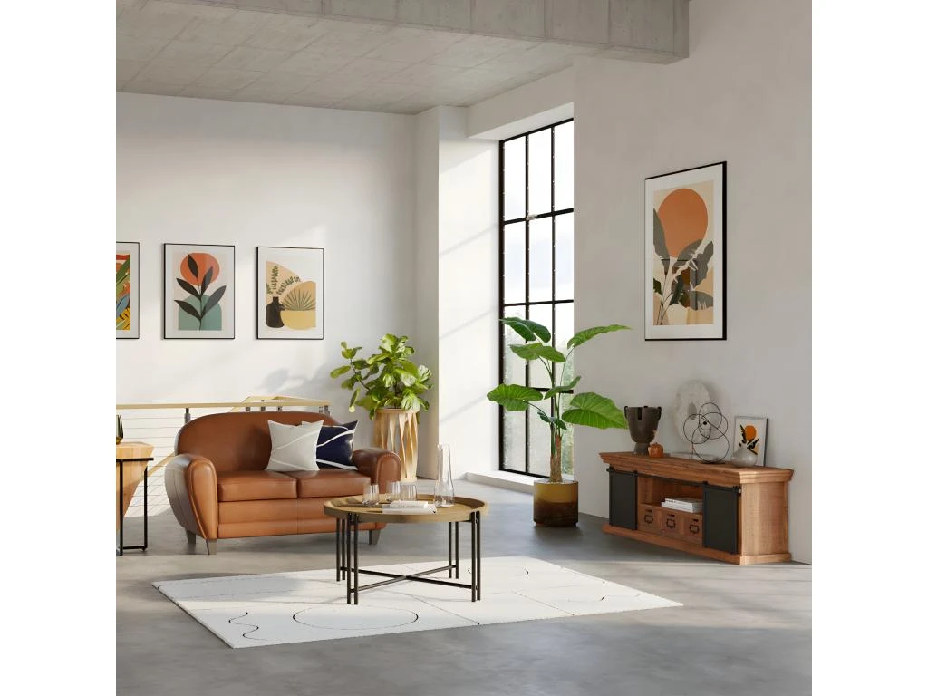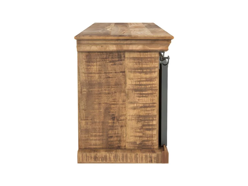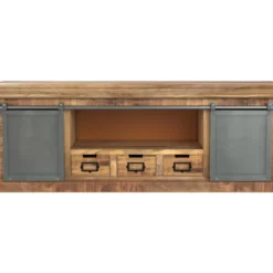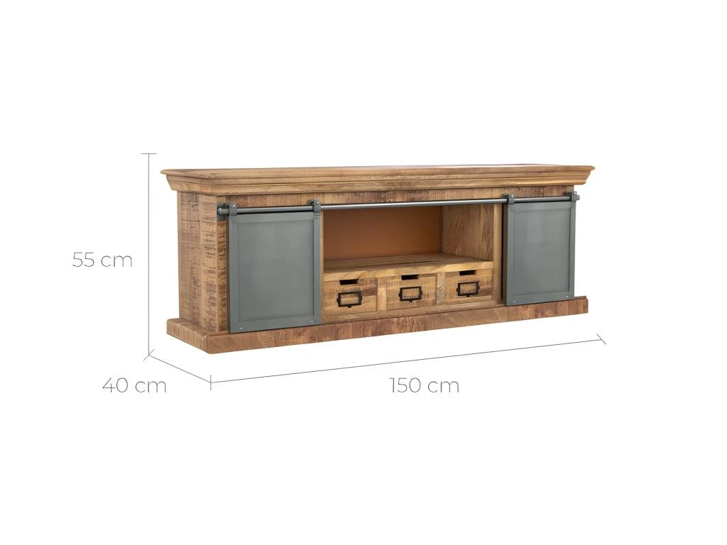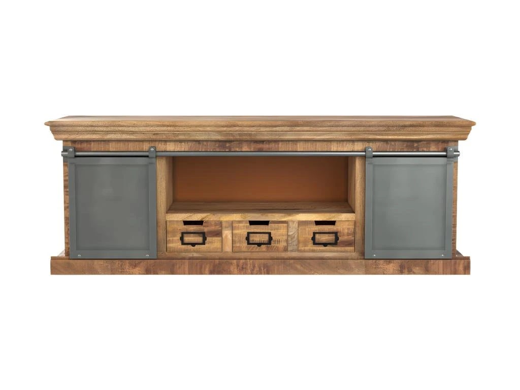 Ce meuble TV en bois de manguier massif qui marie astucieusement le bois et le métal comprend 3 tiroirs et 2 portes coulissantes où vous pourrez entreposer vos effets personnels.