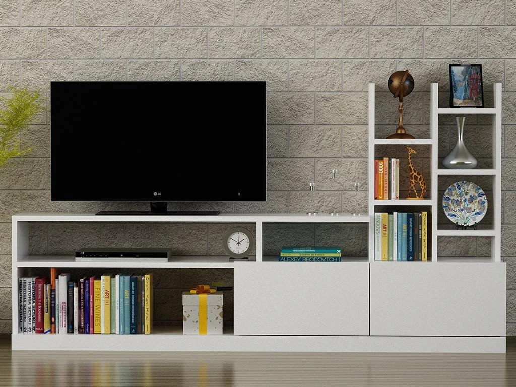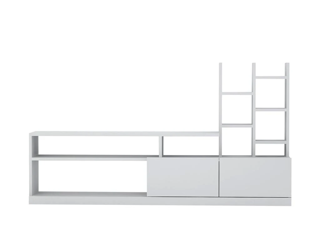 Le meuble TV FIDANA vous offre design minimaliste et s’harmonise à de nombreux types d’intérieurs. Composé de 2 portes, 3 grandes niches et 5 petites étagères qui forment un coin bibliothèque, vous pourrez facilement y ranger vos appareils, câbles, livres et autres accessoires.