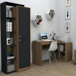 Base Étagère 1 Porte Vitrée Et 2 Tablettes De Rangement, Finition Chêne Structuré, Blanc.