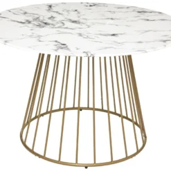 composée d’une structure en fer légèrement conique qui supporte un plateau rond en verre trempé effet marbre, cette table apportera une touche chic et élégante à votre salle à manger.