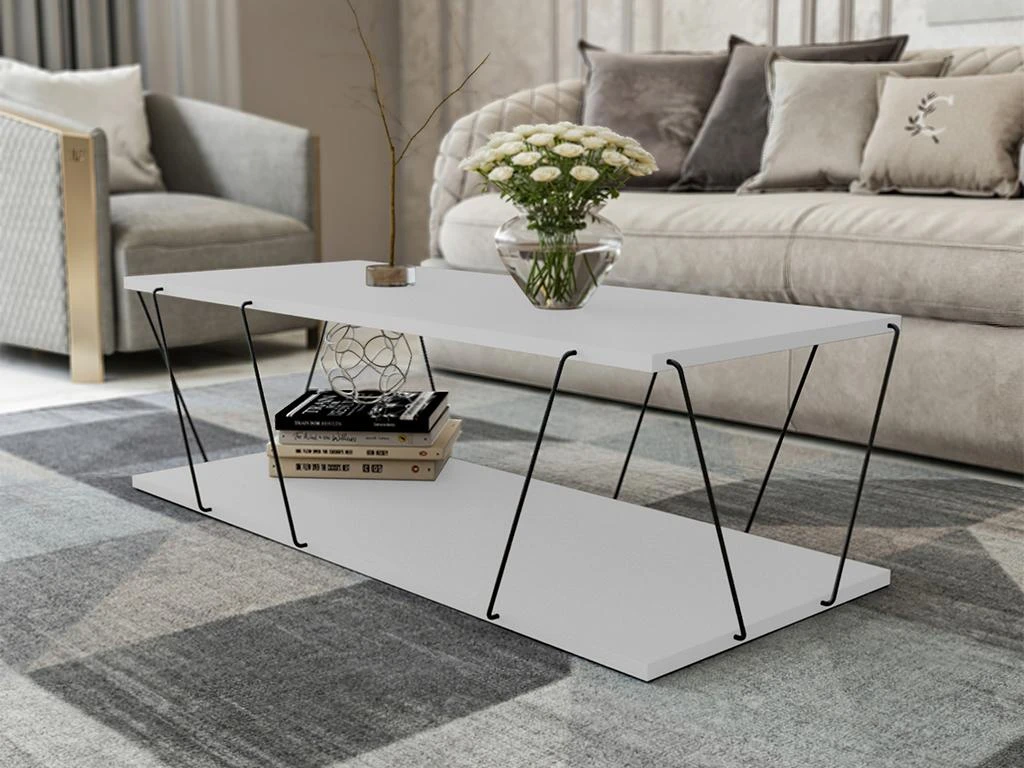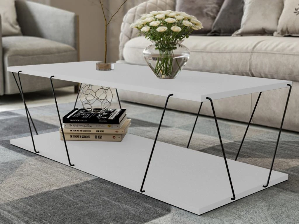 La table basse DELORY dispose d’une étagère qui vous permettra d’y placer vos accessoires et décorations. Ses plateaux sont soutenus par des barres métalliques noires qui offrent au meuble un style original et design.
