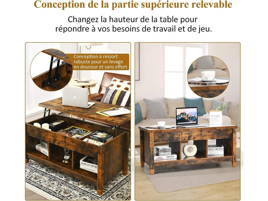 Cette table basse dotĂ©e d’un systĂšme de relevage ingĂ©nieux combine Ă©lĂ©gance et grand espace de rangement cachĂ©. Elle apporte un style classique et une fonctionnalitĂ© indispensable Ă tout espace de vie. FabriquĂ©e en panneaux de particules et avec des pieds en bois massif, la table est solide et rĂ©sistante pour une utilisation quotidienne. Le mĂ©canisme fonctionnel de vĂ©rins Ă gaz permet au plateau de se soulever et d’avancer en douceur pour crĂ©er un espace de travail ou un coin repas confortable lorsque vous vous installez sur votre canapĂ©. Outre le grand plateau, un compartiment cachĂ© en dessous permet de ranger les objets du quotidien. Les trois rangements cubiques peuvent contenir des couvertures, des livres et des collations facilement accessibles. Ce meuble d’appoint pour la maison peut servir de table basse fonctionnelle dans un salon, un bureau, une salle de rĂ©ception ou un espace limitĂ©.