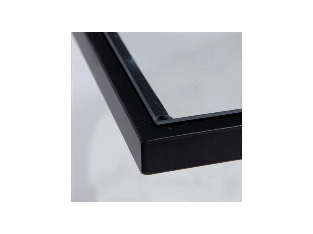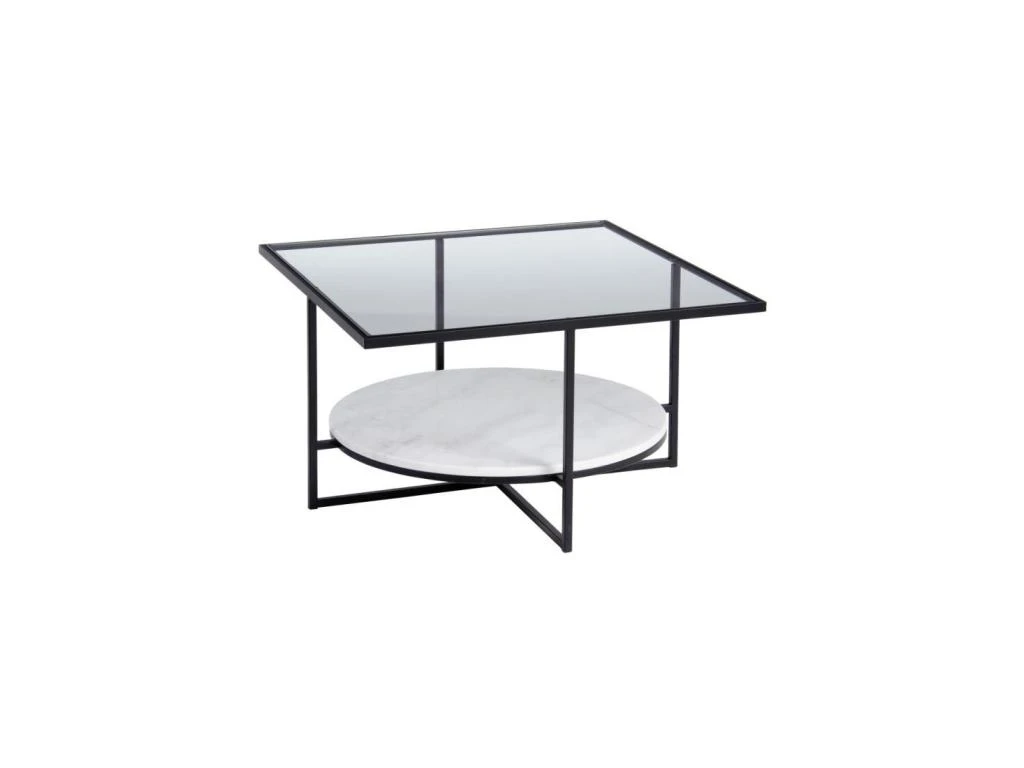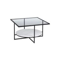 La structure en acier laqué noir de cette table de salon se combine à un plateau verre préservant la légèreté et permettant de dégager la vue sur le plateau inférieurfaisant appel à du marbre Blanc de Carrare.