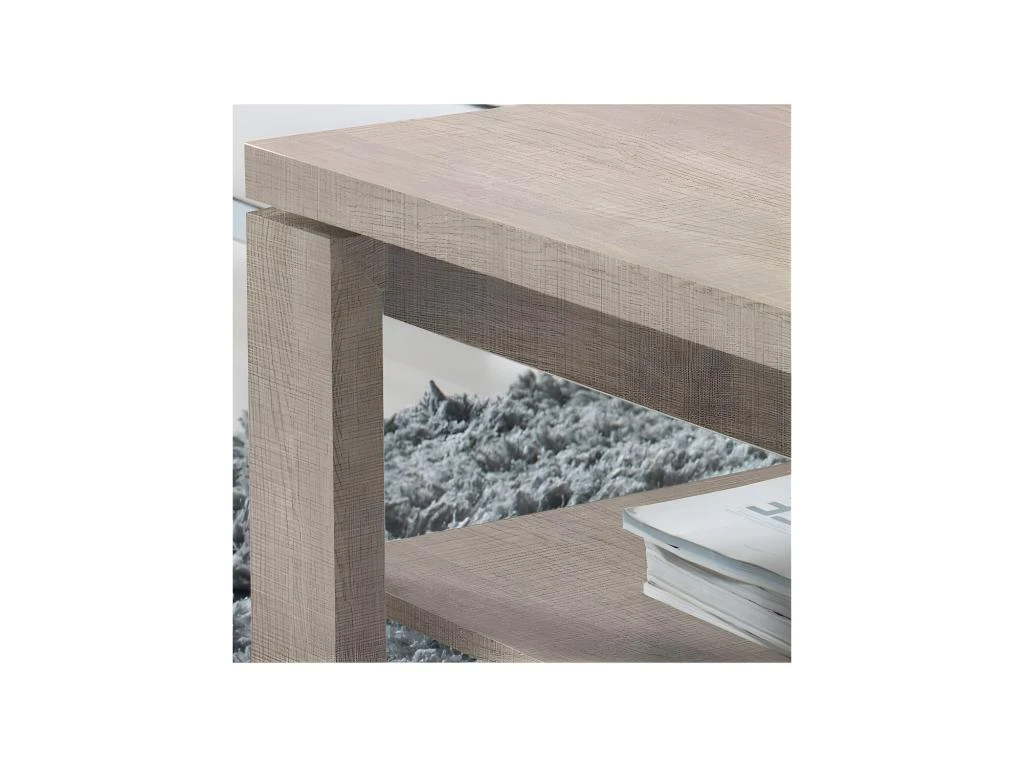 Table basse moderne et contemporaine avec plateau relevable et décor chêne clair.