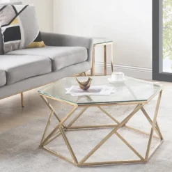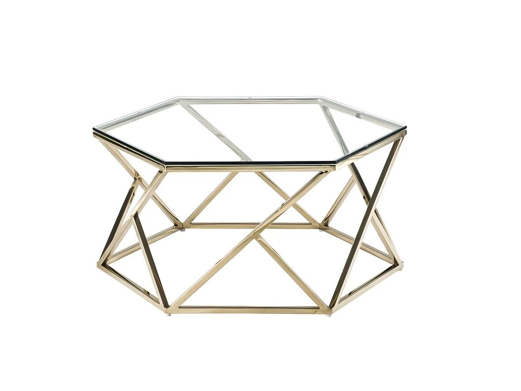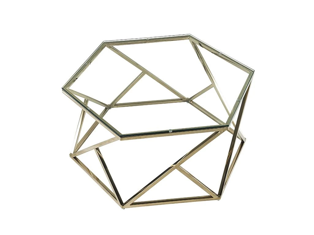 La table basse KERIANE est composée d’un plateau hexagonal en verre trempé et d‘un piètement en acier inoxydable. Ces deux matières s’équilibrent parfaitement entre elles et dégagent une impression de légèreté.