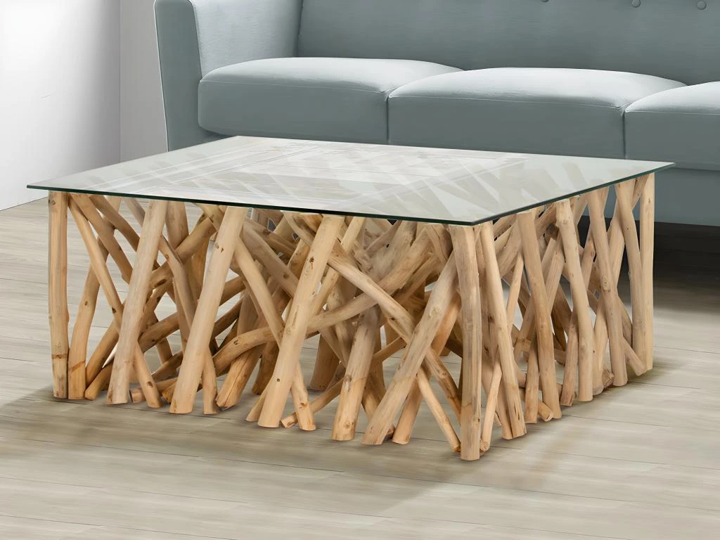 La collection GAYANA est un appel à la détente ! Sa table basse est composée d’un piètement en branches de teck qui soutiennent un plateau carré en verre trempé. Spacieuse, vous pourrez disposer aisément tout le nécessaire pour un apéro réussi !