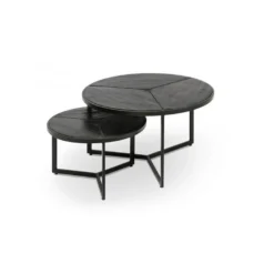Splendide table basse gigogne rondes de notre collection LAVE conçu en bois massif exotique (magnolia) avec finition noir. Elles sont dotées d’une structure en métal noir.