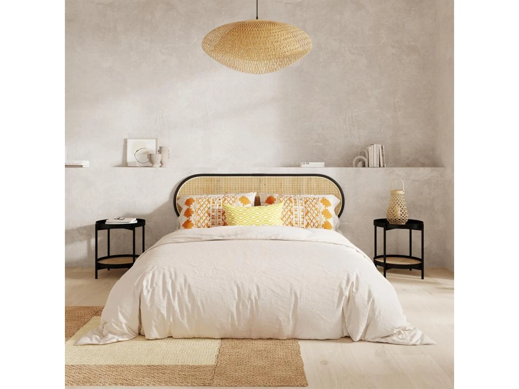 Réalisée en cannage et en bois massif et placage de mindi, cette table basse séduit par son format rond. Vous apprécierez également son piétement en métal noir qui vient compléter une allure graphique. Le mindi peint en noir est une essence exotique robuste qui booste la déco.