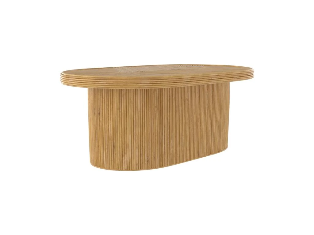 Entièrement composée de rotin, cette table basse se distingue par son aspect brut. La teinte naturelle offre un motif dynamique, entre un jeu de chevrons et des lignes verticales. Son plateau épais est robuste et offre une surface permettant de disposer des objets déco. Un socle constitué de tiges de rotin donnent un effet palissade original.