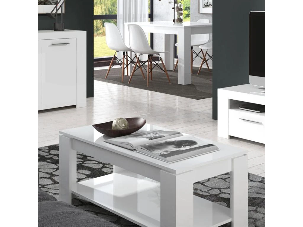 Table basse rectangulaire plateau supérieur relevable ambiance moderne finition blanc mat Dimensions: L 102 x l 50 x H 43/54 cm Matière: Panneaux de particules – Mélamine (15 mm) – Bords 0.6 mm – Charnières métalliques Teinte blanc mat Plateau relevable avec petit coffre de rangement Double plateau Poids maximum supporté par le plateau relevé : 5 Kg / fermé : 30 Kg Assemblage: Livré démonté – 21 Kg – 1 colis Fabrication: espagne