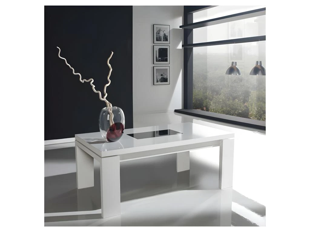 Découvrez cette magnifique table basse avec plateau relevable et finition laquée blanche et verre noir.