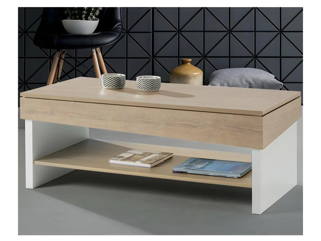 Le dessin moderne de cette table basse met en avant le mariage d’un revêtement chêne blond et de bois blanc.