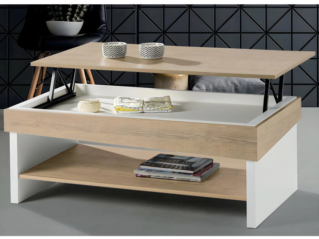 Le dégagement libéré par l’ouverture du plateau vous offre un espace de rangement qui permettra de loger revues, télécommandes et divers objets.