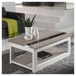 Apportez de la modernité dans votre salon avec cette table basse laquée blanche et chêne clair avec plateau relevable.