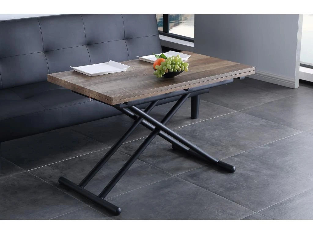 Table basse relevable et extensible avec plateau de couleur noyer en MDF / papier laminé. Convertible en table à manger. Structure métallique noire. Dimensions: