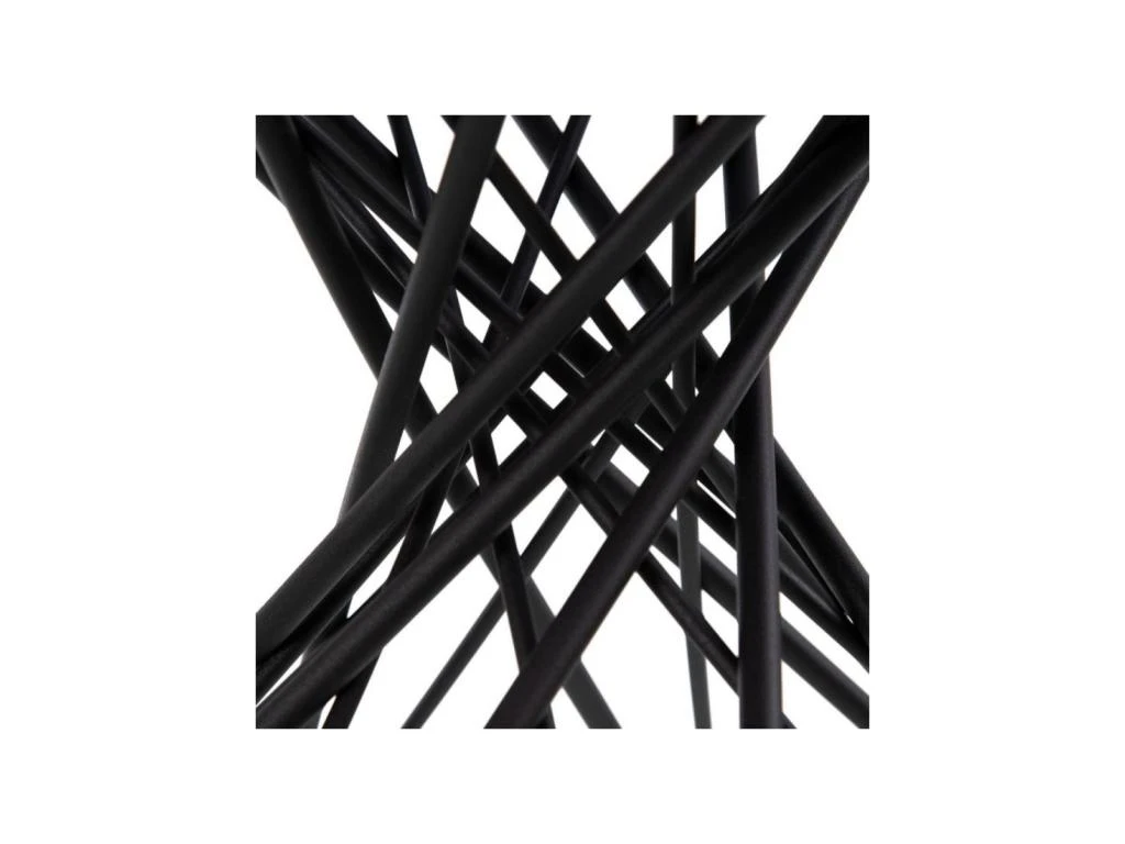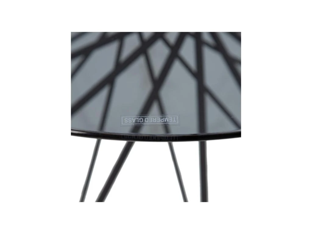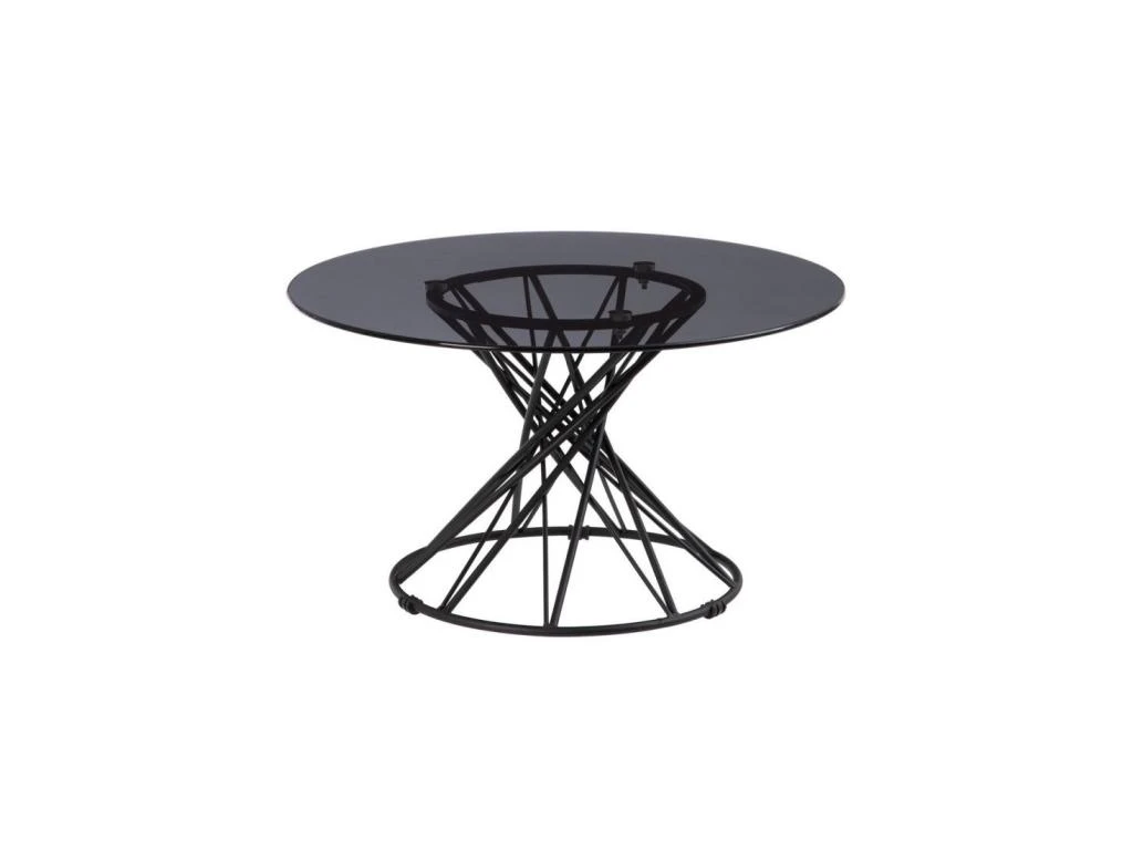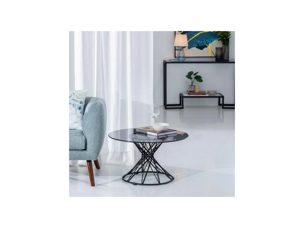 Table basse ronde avec structure filiforme en métal laqué noir et plateau en verre trempé.