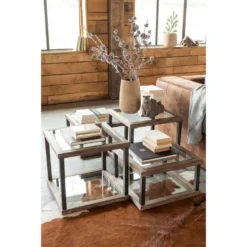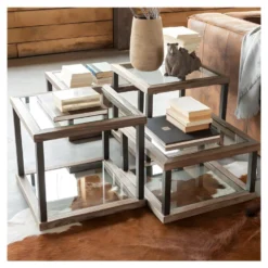 ALIDA – Set De 3 Tables D’appoint Gigogne Plateaux Bois Teck Recyclé Structure Métal Noir