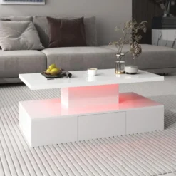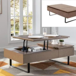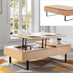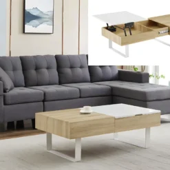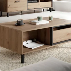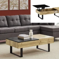 Table Basse Avec Plateau Relevable Et 1 Tiroir – MDF Et Acier – Naturel Et Blanc – BALUN