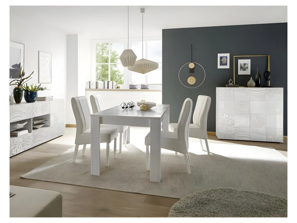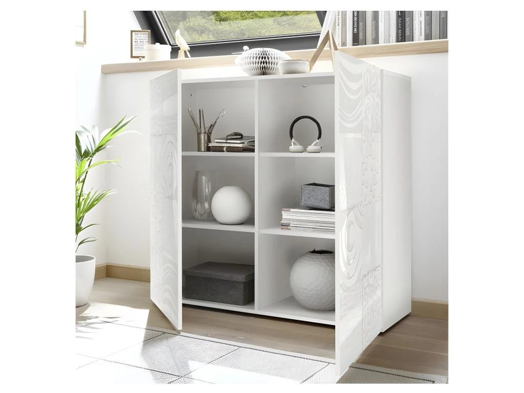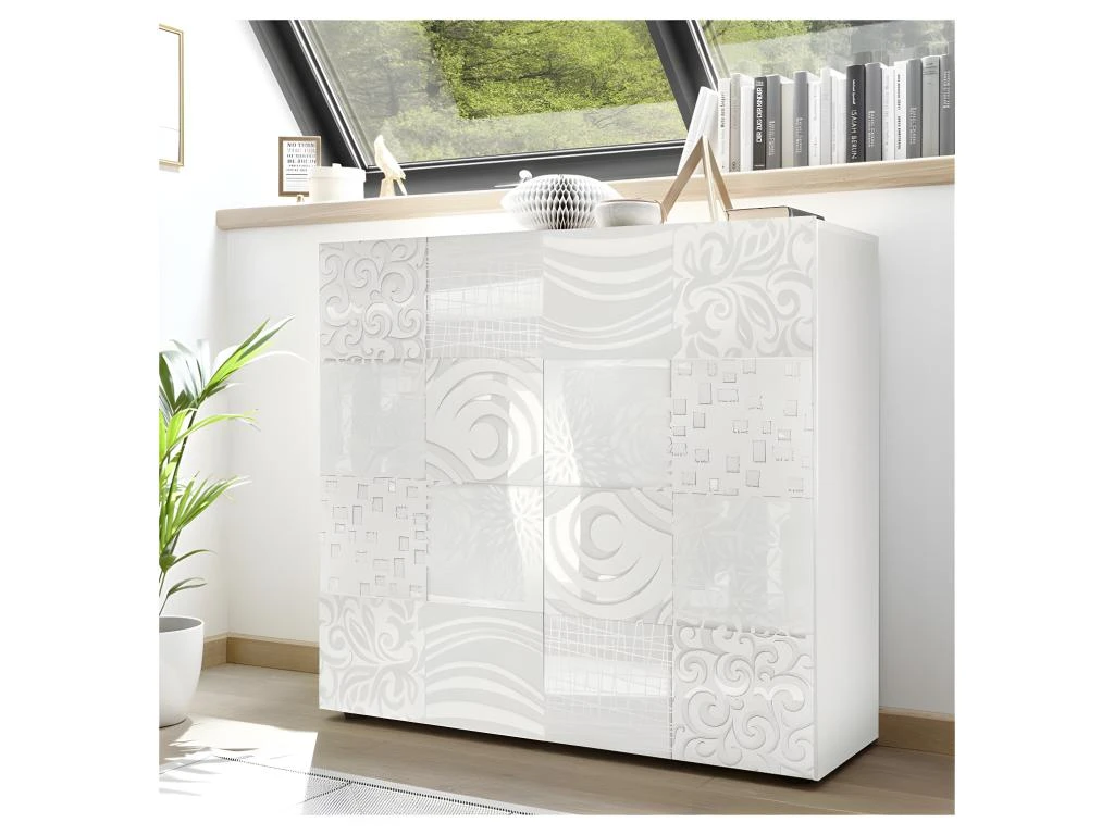 Cette armoire de salon contemporaine au format original met en avant une façade sérigraphiée de motifs variés qui sont mis en relief par la véritable laque Blanc ultra haute brillance.