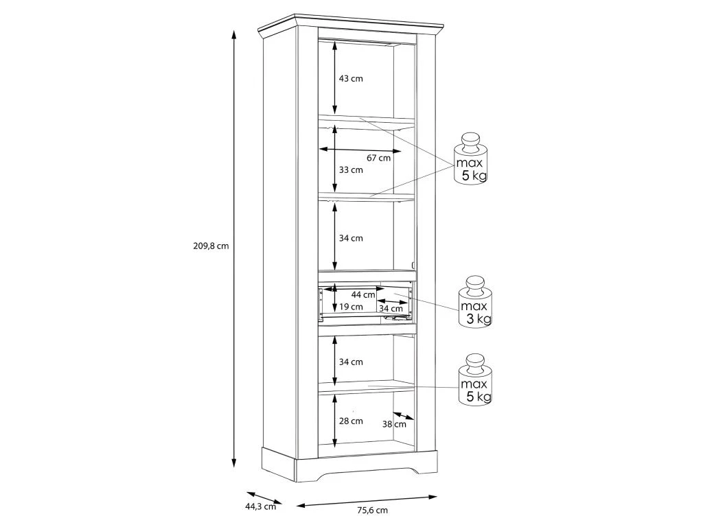 - POIDS max supporté : Tablettes amovibles : 5 kg / Tiroir : 3 kg.