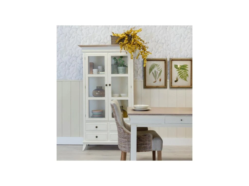 La mise en avant d’une teinte crème patinée et d’un plateau ton bois naturel blanchi apportera de la clarté tout en rappelant le code esthétique des meubles de tradition.