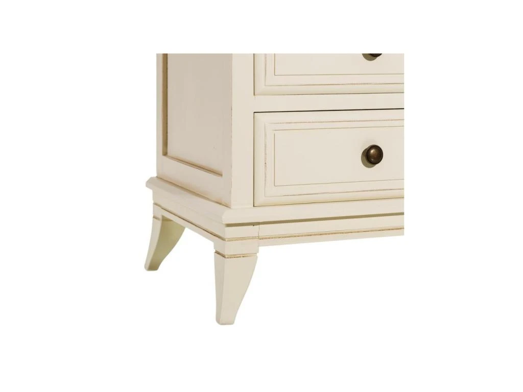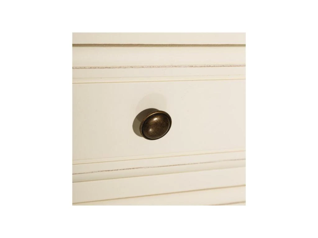 Focus sur les sculptures et moulures délicates présentes sur le piétement, les tiroirs et les portes. Ce meuble pourra alors être intégré à une ambiance bord de mer ou même un environnement classique que vous souhaitez moderniser sagement.