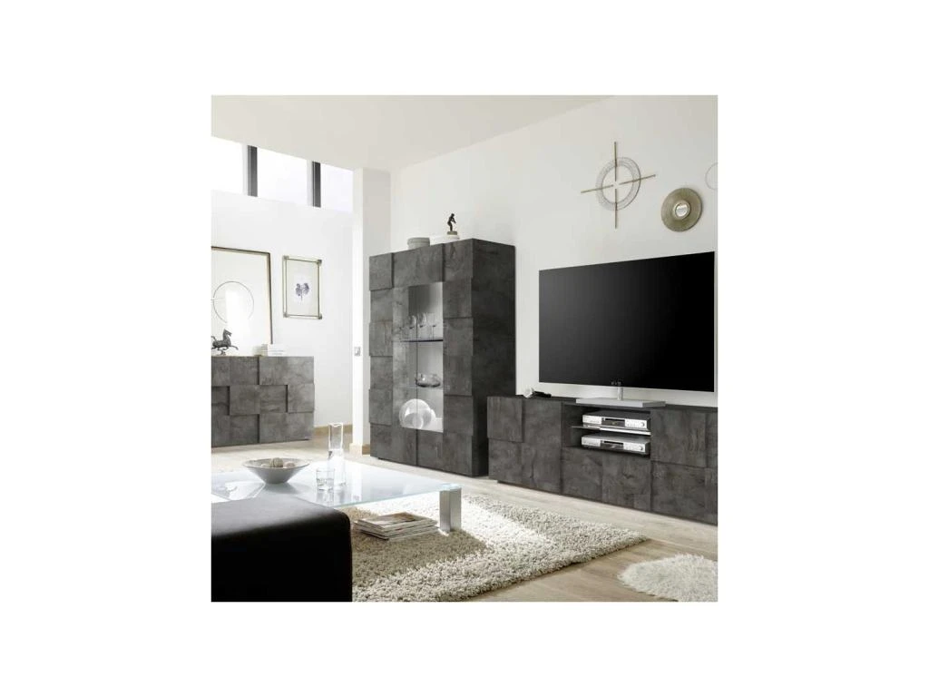 Les façades des ouvrants de ce meuble audio/visuel sont pourvues d’un damier en relief magnifié par la finition béton ciré foncé, bluffante de réalisme.