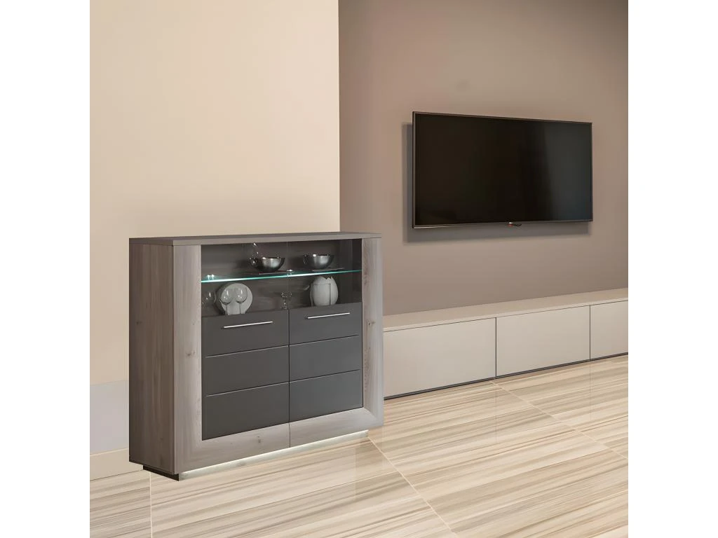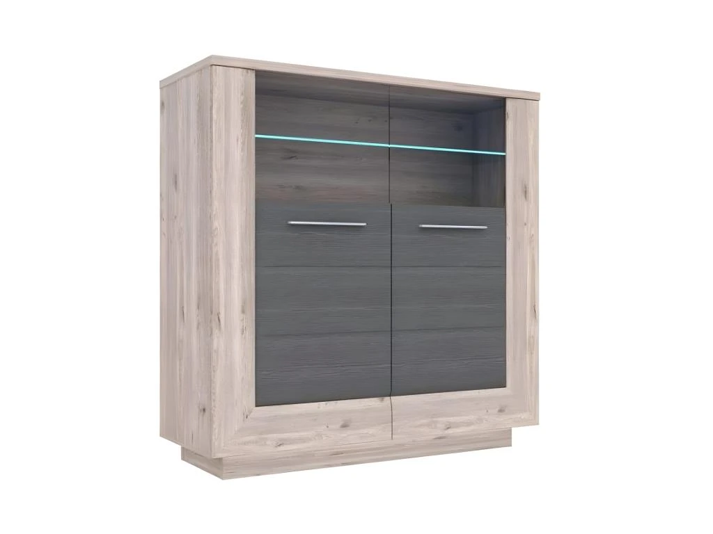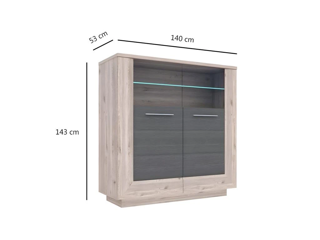 Craquez pour une décoration harmonieuse grâce à ce meuble de rangement, qui habille avec élégance et raffinement votre salon. Faite en panneaux de particules décor bois clair et gris, elle inspire un design naturel et contemporain. Avec ses 2 placards, cette vitrine sera très pratique pour vous organiser au quotidien. Vous avez la possibilité de ranger vos ustensiles de cuisine, votre vaisselle ou de l’alimentaire. Installez de la décoration au niveau de la vitrine en évidence et sur le plateau, pour davantage la mettre en valeur. L’armoirette/vitrine SHERA est fabriquée en Europe, elle apportera de la modernité ainsi qu’une touche naturelle à votre intérieur !