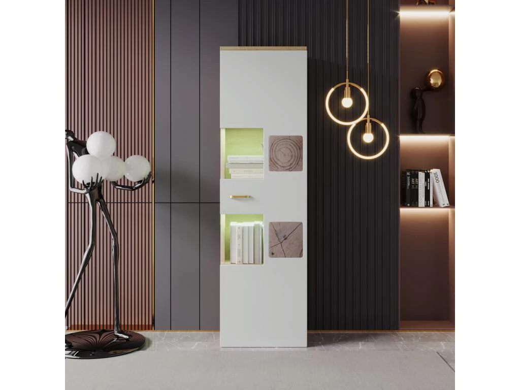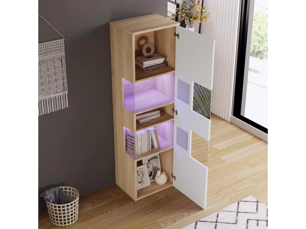 Une caractéristique remarquable de cette vitrine est l’éclairage LED intégré. Disponible en 7 couleurs, vous pouvez adapter la lumière à votre humeur ou à votre intérieur.