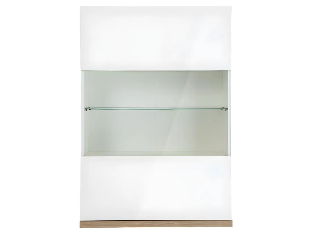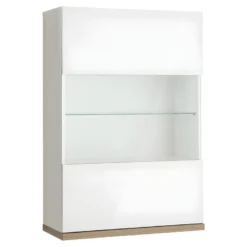 Cette vitrine murale vous permettra de ranger vos affaires sur ses étagères derrière ses portes, mais également d’exposer des objets de décoration au-dessus du meuble et sur ses étagères derrière la partie vitrée d’une des portes afin de parfaire votre intérieur. Un mariage parfait entre couleurs claires, sa finition blanche brillante viendra éclaircir la pièce tandis que la petite finition bois clair apportera une ambiance chaleureuse.