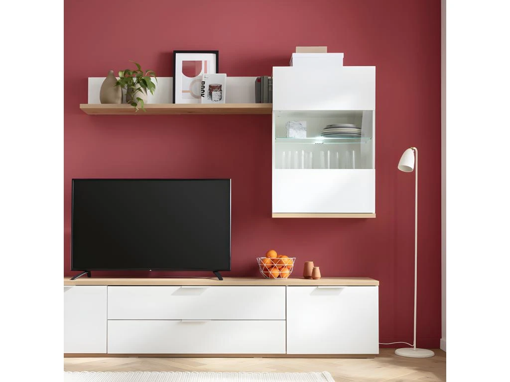 Craquez pour la vitrine murale 1 porte réversible finition chêne clair texturé et blanc laqué VERONICA.