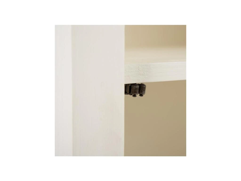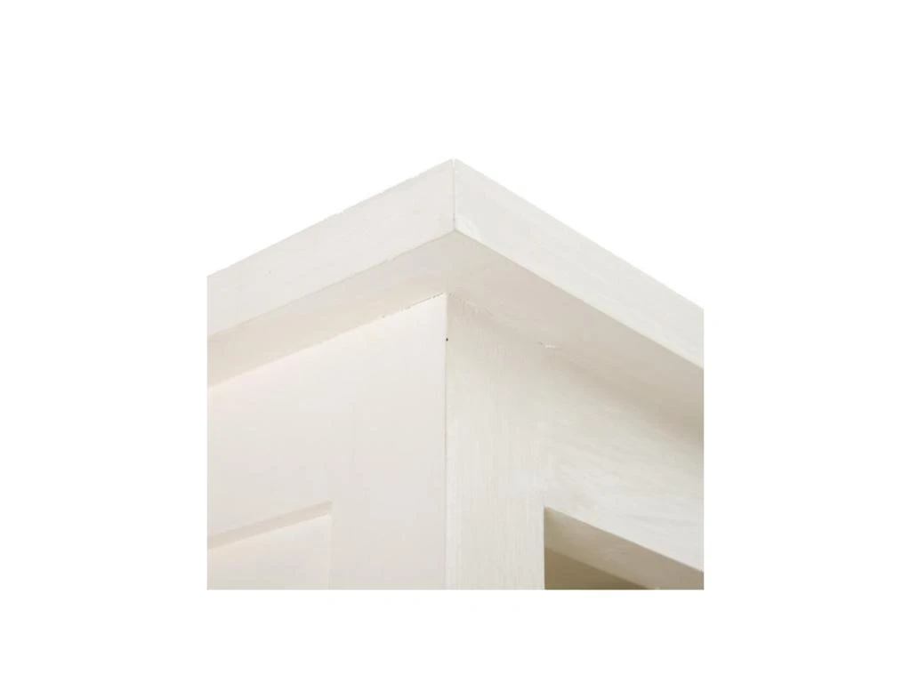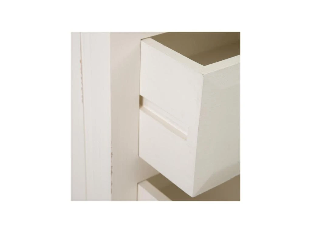 Mettant en oeuvre du bois de Mindi ce meuble bénéficie d’une robustesse satisfaisante et d’une qualité perçue valorisante, revêtu d’une laque blanc cassé il propose aussi un léger vieillisement qui lui apporte authenticité et unicité.